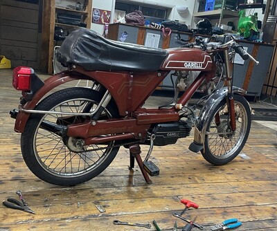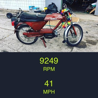 Another mythical cheap Ohio bike, this popped up a few miles from my house, and I couldnt pass it up, one Corolla ride later it was mine. It was in real good shape, but the cylinder was made out of carbon, so I swapped on the Polini 70, paired it with my favorite carb, the VM18, tracked down an NOS Polini chamber, slapped it together with stock gearing and bam a surprisingly quick off the line Garelli. As you can see it tops out at 40, but unlike my other SSXL that uses a Hammer clutch, this thing is all stock rubber so I'll take the decent low end and let other bikes go faster. I barely rode this in 2017, our old shop was located on the outskirts of the city and any bike that couldnt hold 45 was gonna get you mowed down, however our new downtown shop will be prefect for this, ripping around city streets will be a blast!