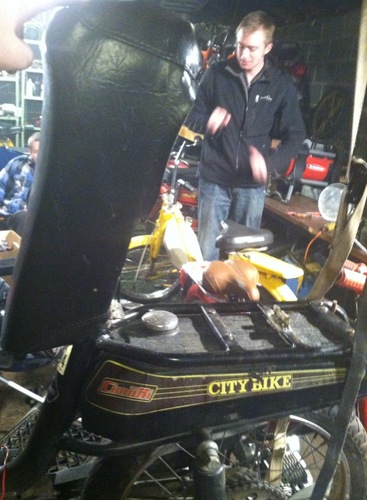 100$ City Bike that I missed once on Craigslist, popped up later at a Motor City Riot Moped Monday for 100$ sold a few junk parts I had with me and bought this gem for 15$ out of my pocket! The kid mentioned that he thought it had some 50ish cc kit but he didnt know, so I brought it home, had a 55cc Autisa Kit/15 Amal/square port 15mm Puch Sha Intake. Cleaned her up re-built the bottom end added a Puch Techno Circuit (made the bracket with metal cut out of a 1950's stove side panel) jetted in the cold hardwired it up using the high/low beam switch for a kill. The seat was fun as well, whoever had it before me cut off the seat post, but it came with some longish seat and as I had nothing into it I decided to use it. Bought a door hinge from Homedepot and welded it to what was left of the post, the rest to the longish seat then made a little catch just above the tank so it wouldn't wiggle, but still rock forward to expose the tank. Switched out the stock 16in spokes for 17in Sachs snowflakes, re-geared to 10x39 with blue springs!