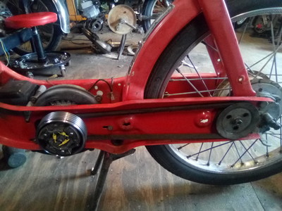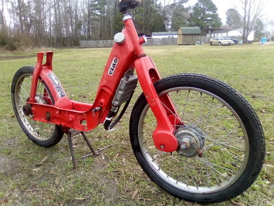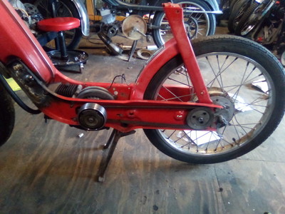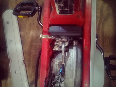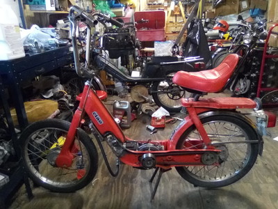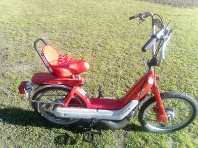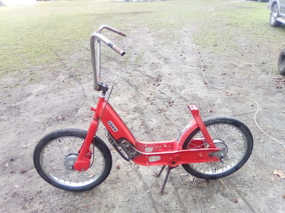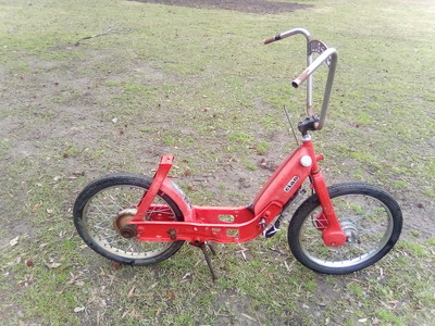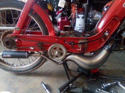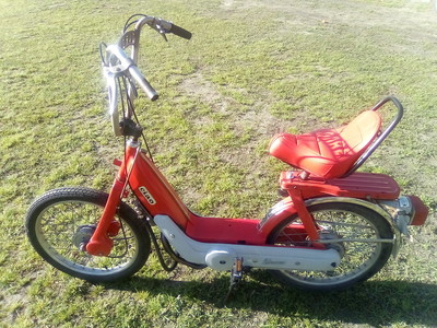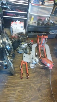 1974 Vespa Ciao that I bought and ended up needing tank repair. After repairing the tank I decided I wanted to go for a sleeper look so I started out looking for all the body panels. The engine was seized so I did a complete rebuild with bearings, seals, gaskets and a stock crank that I cut 5/10 in attempts for more performance. The top end is the 43mm Polini W port race kit with a Polini water cooled head kit I got from Italy. The pipe is the Polini top pipe and while the clutch remains single speed it was upgraded with Simonini clutch bell and Malossi 4000rpm springs for starters. The seat is a Puch chopper seat and the bars were custom made for me by a friend in the Netherlands. It also sports the Malossi Sha 13.13 carb/filter kit and stock points to keep everything simple.