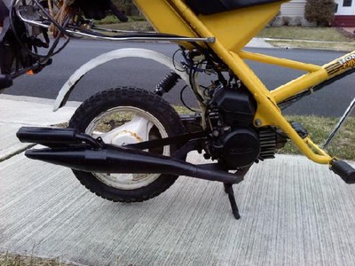 1980 Honda na50, 1981 Honda nx50 (express sr) engine swap, stock head, 46mm parma kit, 15mm del, mlm intake adapter, stock na50 intake, stock nx50 reeds, nu50 weakends exhaust (dual bled), does about 40 with a stock unnotched variator, with stock belt. 45mph with bx26, 36mph with gates 9295, still running the SR 10 inch rear wheel, need to find a 14 and fiddle with variator some-more, hoping for 50mph soon. def within reach. EDIT: gps'd 44.5 with the bx27 and 10 inch rear wheel still...maby 50 is gonna be harder to achieve than previously thought.