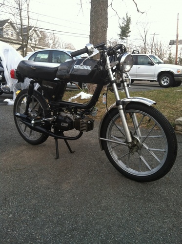 Heres my 1982 general limited after having two failure's of other mopeds, this is the one that has stuck around and has been my on going project. Been pretty much the same for the past year or so but its going to be getting some upgrades since its about time. As of right now it just has drag bars on it, the old amal carb is whats in the picture, rear fender has been removed, super small rear sprocket (not sure how many tooth) and the kit, bike is super fun and cant wait to get some more parts for it this year and clean it up