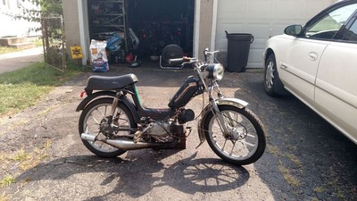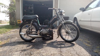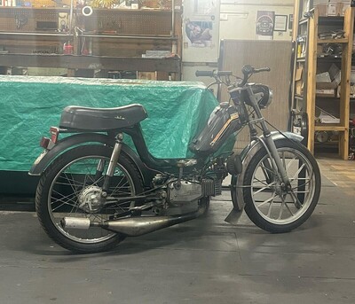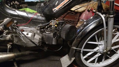 55cc Autisa kit heavily ported, custom made header spigot mounted to the kit, which has the exhaust studs filled in and moved out to accommodate the wider header, intake heavily ported again intake studs filled in and moved to open the intake to 24mm, goes fast, off the line its not terribly quick, stock springs for now, maybe I'll upgrade them come spring. Puegot forks, tomo seat blahblahblah...