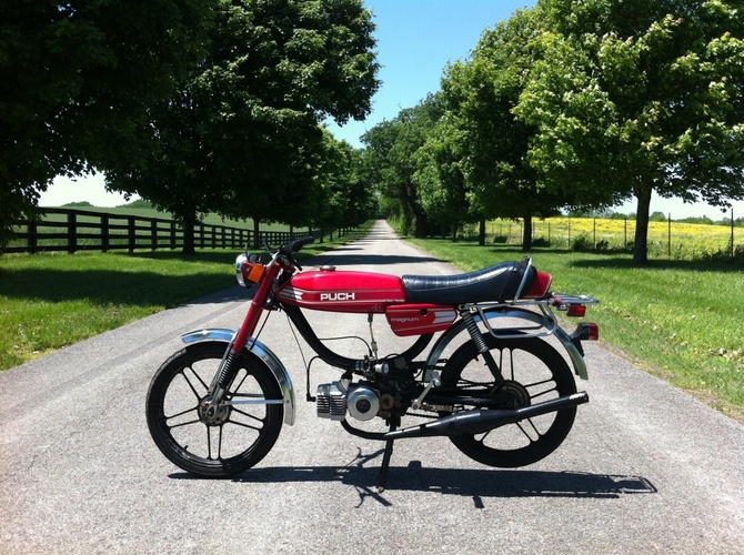'77 Parlini reed kit, cylinder decked and port matched, transfers widened to previous case match, exhaust raised/widened/dropped 1mm, ringland ported single ring piston, reworked kstar narrow squish head. Rebuilt E50 with stuffed crank and a mildly lightened 3 shoe clutch with kickstarts. Pietcard 2041 auto retarding CDI with treats 12v stator and Olympia coil. 21 racing PHBG on an mlm intake, polini 4 petal reed block with an mlm Cali pipe. Bike is hardwired, with red led-strip taillights that I plan on making brake lights. Clubman bars, temp and tach gauges, and black mags with savas. Run a BU8H plug and 0w20 Mobil for tranny fluid, mix Saber at 80:1 with 93 octane. 17f-40r gearing, GPS'd at 52 on flat, 55 downhill.