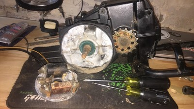You can see from the pictures that I got the E50 off of the frame, and started to take it apart. The stator was essentially rusted solid and full of mud and dirt, and the magnet also pretty rusted.. Into to the parts box they went.