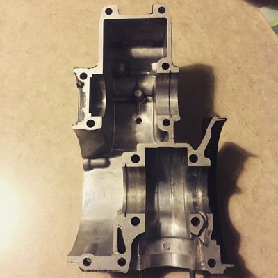 I took the cases apart and the inside wasn't too bad, but lots of old, gummed up oil. I gave the cases some love with engine degreaser, and went to work with a brush. The third pic shows how clean I was able to get the cases. The crank, not pictured, was pretty gross and rusty as well, that also went into the parts box. In the 4th picture you can see I disassembled the main gear and pulled the bearings. The bearings were in decent shape, but since I wanted to rebuild it from the ground up, I decided to replace them. some engine degreaser and a shop rag, I was able to clean the main gear up nicely.