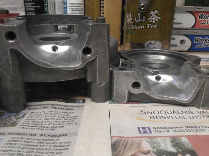 Stock Vespa cases; bored out, built up, matched, and ported all the way through.