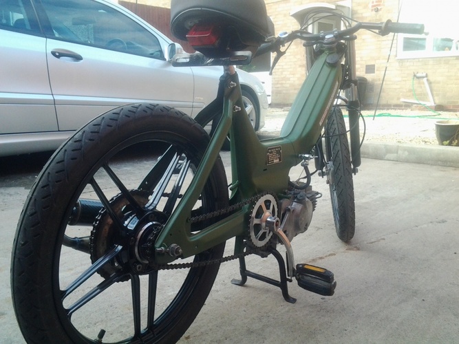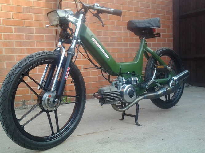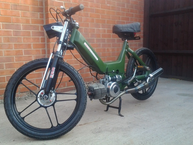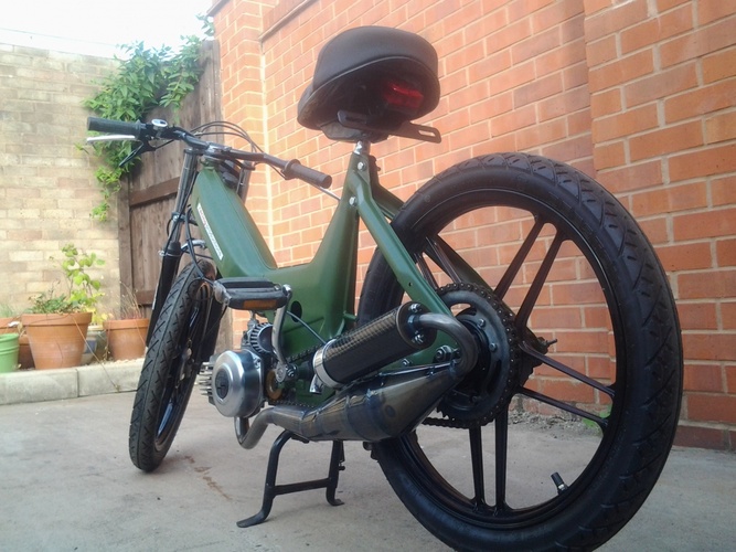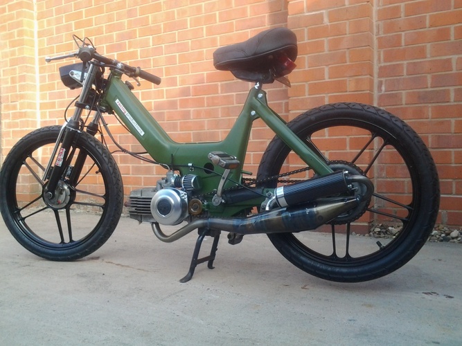 This bike is called Aka Copy Cat.This bike was built as a tribute to Tomahawk mopes in LA. This was the first bike i saw by them and i loved it from the start so i decided to build the nearest one i could, so thankyou Tomahawk Mopeds