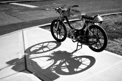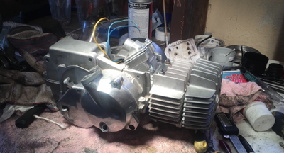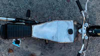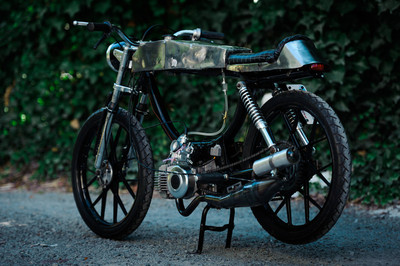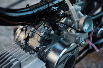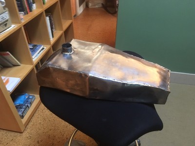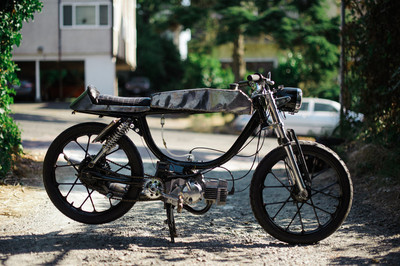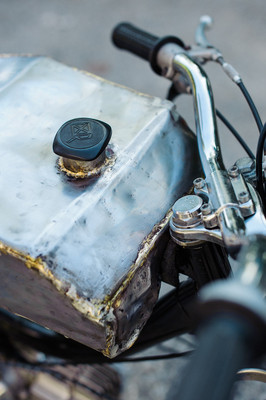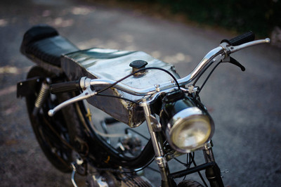 I took an old rusty free spirit frame and welded a crossbar. I took the old rust seat base plate and welded/brazed on a new back and included a locking trunk. The foam for the seat I cut half as thick and then sewed a $4 thrift store leather jacket around. I brazed the tank out of old bumpers a local autobody shop was throwing away. The engine is case induction was made possible thanks to the assistance of snordly.
