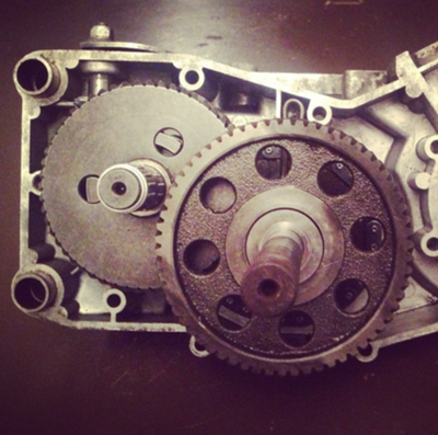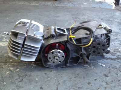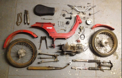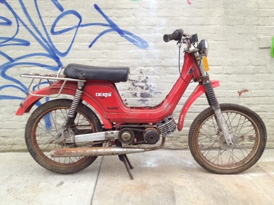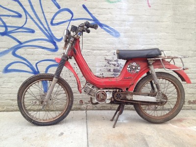 Debi TT. Was totally rusted out in a basement. Got a new life. Engine rebuilt with 77 crank, and a modest 60cc kit. The HPI ignition and the zen pipe make this bike ripp! Well, and its a Derbi, so… Custom built pull start (much needed because the starter clutch bell was rotted out with rust, and broken off.) Wheels were rebuilt by hand using moby rims, and new custom made spokes.