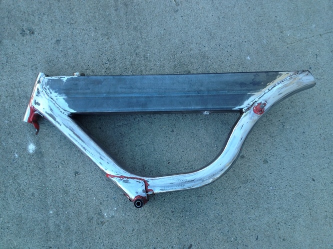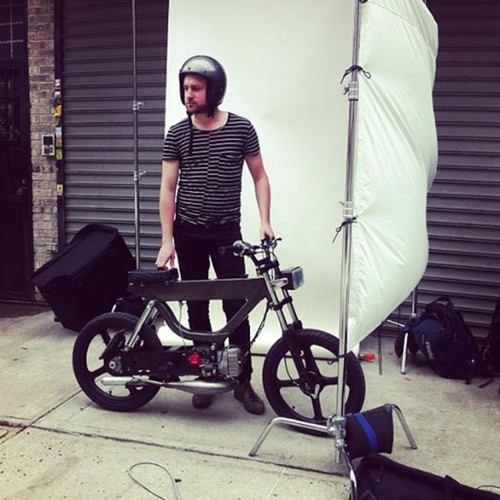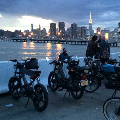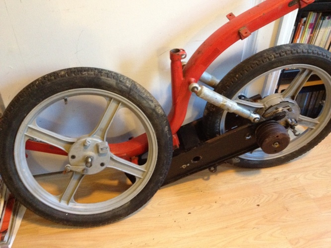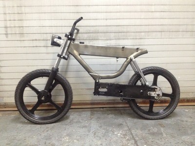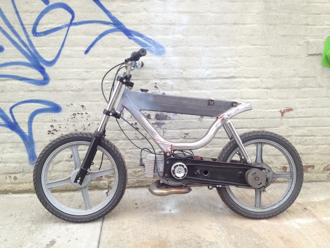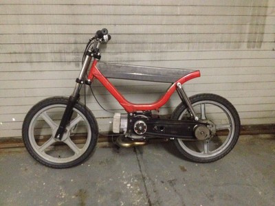 Vespa, Bravo. Custom crossbar tank integrated into frame. Seat is temporary, still trying to get the shape and placement right. Malossi reed case, w/ 19mm PHBG. BIG DEPS kit. HPI inner rotor CDI. Malossi ToO BaD exhaust. Race gears in the rear wheel. 9V lithium LED built into headlight. Pull start, and yeah, no pedals.