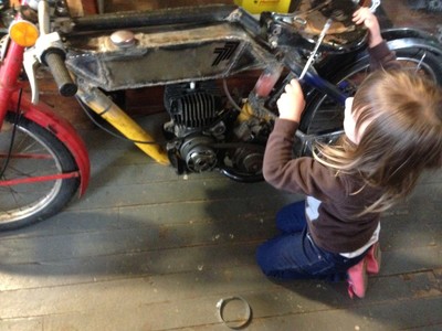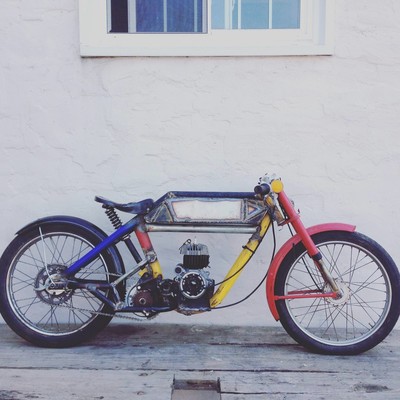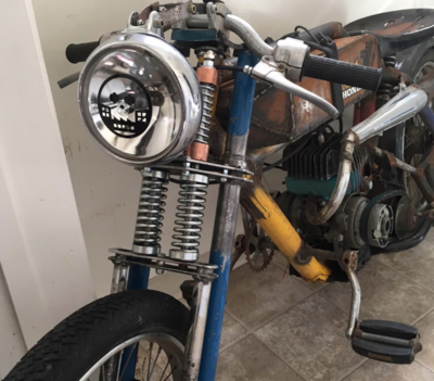 Two hobbit frames and one subframe chopped up and put back together with a bunch of random parts and scrap laying around the garage. Crappy Harbor Freight welder - nothing cleaned up, ratty as hell. You might die riding this. Handmade 16g gas tank. "Jockey" starter made from puch headlight bucket, Indigan pawl, and generic pull starter with a pulley and a pipe. The exhaust pipe is made from stock Puch and Tomos pipes cut, flipped and welded together w/ generic briggs style muffler. Engine is 51 bottom w/ ported 52 cylinder and ramp plate. Notched Variator. Modified MLM intake and Derbi flat reed block. Puch magnum head. Put some epoxy in the 51 weights to make them heavier. Drilled out stock 51 carb. Stock points ignition. Has a transmission brake on a Hobbit rear wheel hub which was chopped up and mounted to a Puch sprocket then chain fed to a Puch rear wheel (no brake on rear wheel). Puch front fender mounted as rear fender. Magnum shock mounted under random seat. Bicycle handlebars. The headlight is a police car search light from the 50's. Stock hobbit front end now swapped for DIY springer front end made from rigid puch free spirit forks w hobbit front wheel. Good luck changing the spark plug with a normal wrench.