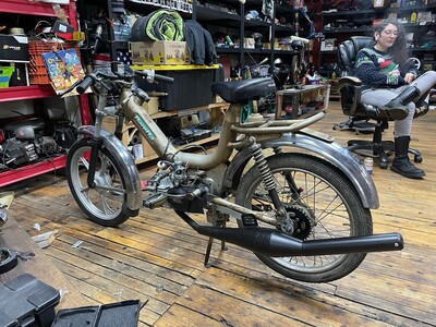 A Baretta V1 that I used to test Maitlands first run of spacers, the original build had a Puch TCCD cylinder, it was cheap and disposable. After I proved that it worked, I kinda forgot about it, until a few weeks ago! I rebuilt the motor with new bearings/seals/gaskets, added a 45mm Treats reed kit, Athena reeds, MlM intake, VM20, Treats BLK pipe, Pietcard timed at 2.2mm btdc (this is the timing Polini's call for so I figured good enough?) w/2041 box, 10x32 gearing, stock clutch w/yellow GY6 springs, counter sunk head, fresh tires and tubes (yay you may notice they are old as shit in the photo, somehow I never took a picture of the finished bike, but rather a video, scroll down for it). I went with the Treats reed kit because midsized kits are super hard to find for the v1, considering the Polini is 73cc's, the BRN 76cc's, and of course the 89cc Monster BRN being available, so why not go smaller? 45mm with the v1 stroke should be like 67cc's I think? Someone else can do the math on that one. Anyhow this thing rips! it pulls so hard, the reeds are snappy, and I am stoked to fine tune that vm20 come spring, though it seems to like the settings I had for the TCCD.