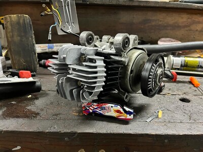Ya I got that Stocko up to 47, and it ran well for many rallies, but death comes for us all. Much like our mortality is destined so are circlips failing on the Stocko, luckily it really only killed the cylinder, but I rebuilt the motor anyhow. Here we goooo, new bearings/seals, Malossi kit, FA50 head cut for Honda's, Treats Variator, one way bearing in the clutch, removed starter shoes, Treats belt, Simo pipe, stock CDI, Malossi intake, 21 PHBG, Polini reeds on a stock reed block, Polini Green clutch springs 35% stronger then stock, stock wiring.