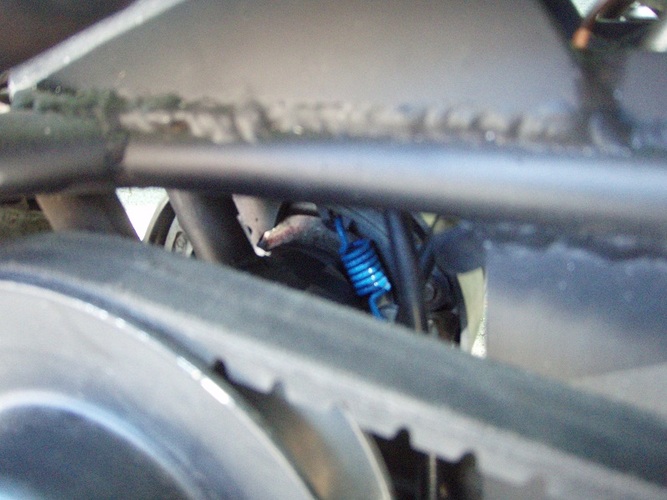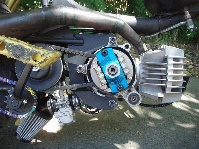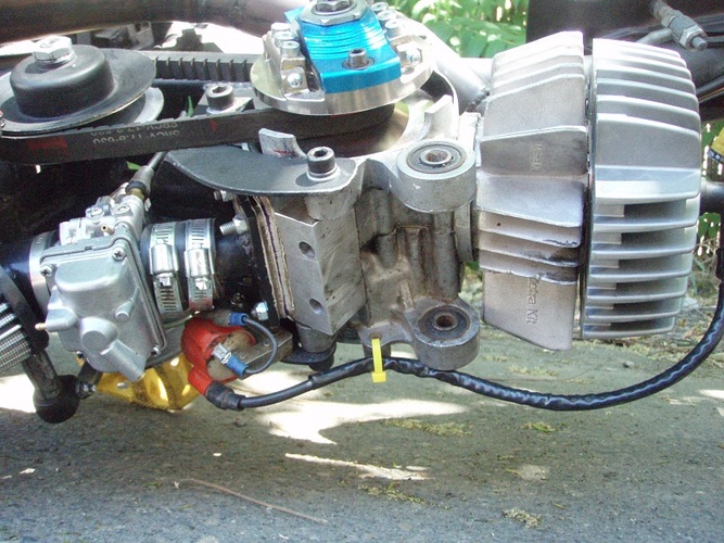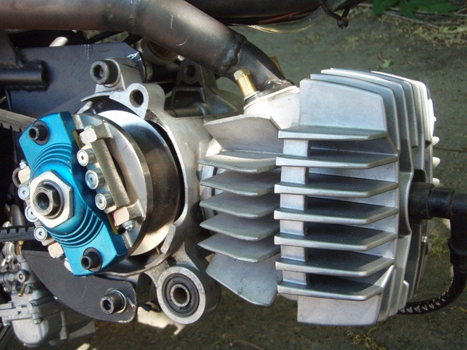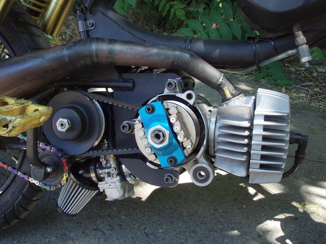variator left side - stock Hobbit clutch bell/variator lathed from 15 deg to 12.5 an 1mm taken from the outside of the bell, stock Hobbit clutch with derb blue springs, starter clutch removed, Derb 6 weight variator. Belt is by Polini for a Honda 50, not sure what that is. Probably some kind of scooter. Rear pulley is stock Hobbit.
