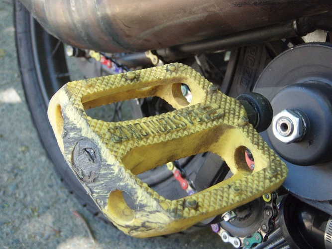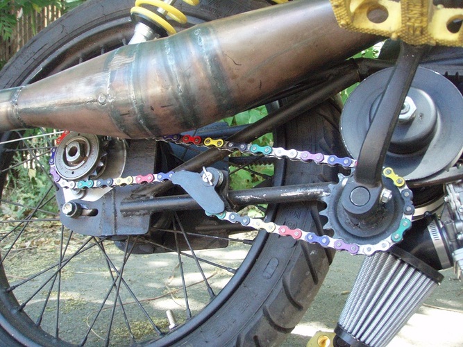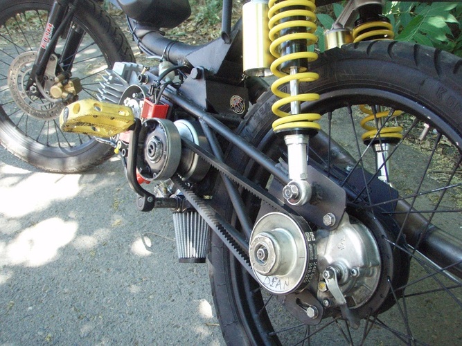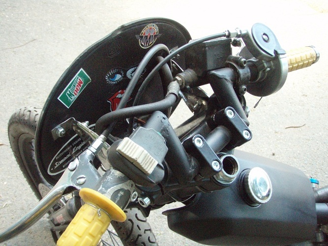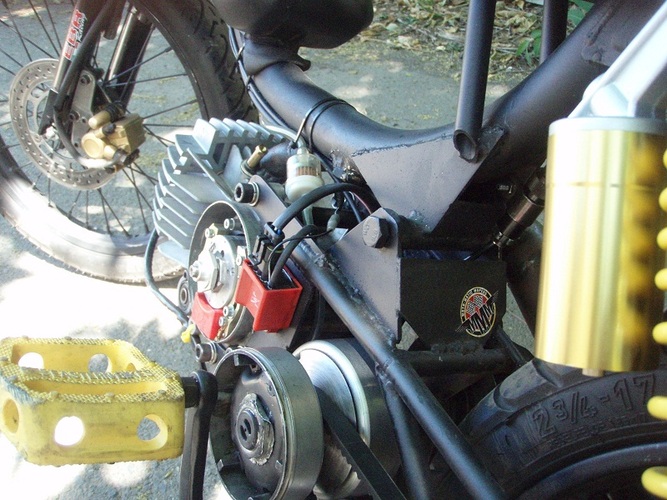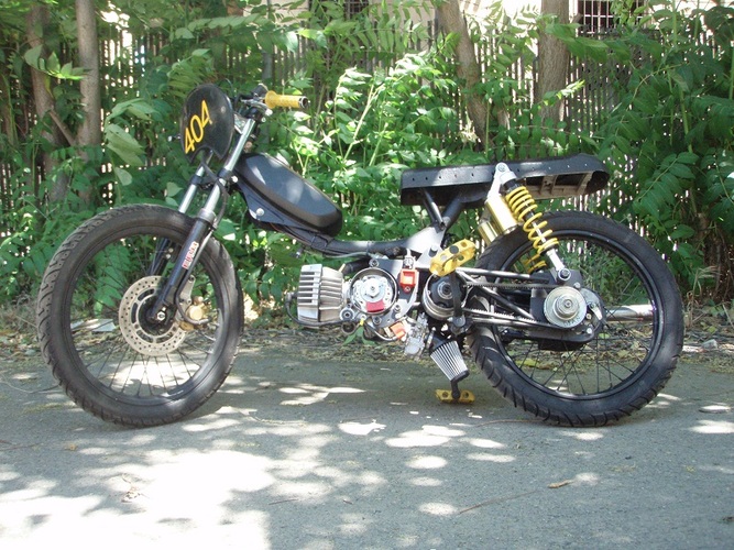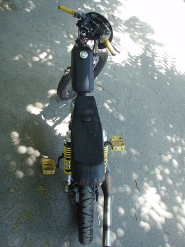 Moby VLX number plate, Pug chain tensioner, Batavus pedal shaft with an 18t mtn bike cog welded on, modified Motion Pro throttle, cut up Magura left lever, yellow Treat grips, yellow plastic BMX pedals, rad (AND CHEAP!) gas shocks from http://mytrailbuddystore.com/, bars are recycled thick walled moped bars, CEV moped kill switch, BMX barends.. I made the fork brace, intake, pipe and swing arm from raw materials, used linear brake line for the rear brake, Treats generic red high-tension coil after I managed to fry the HPI coil, NGK resister plug cap.