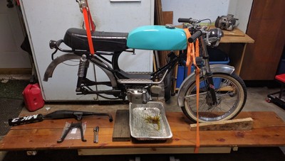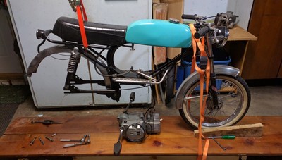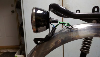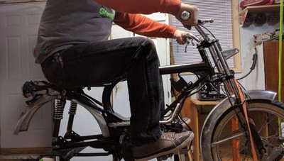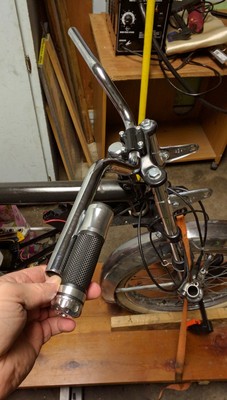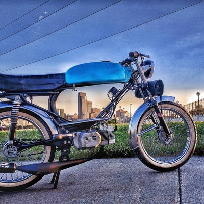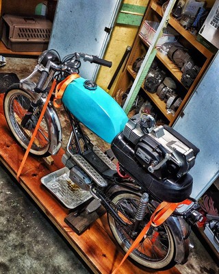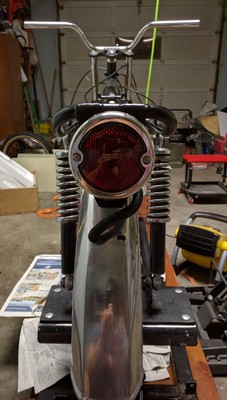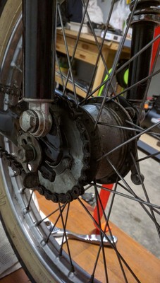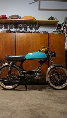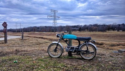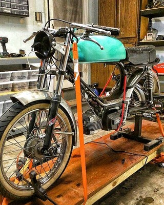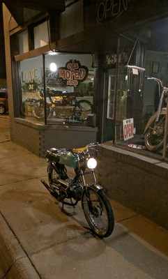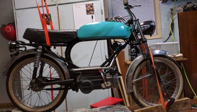 01.03.2017 Happy New Year!! A lot has happened over the break. Handlebars installed. Controls mostly complete. I had to grind down the controls a little to get them to slide onto the bars. Installed a new throttle cable. Installed new grips. Connected front brake cable. Installed bullet headlight. Added some conduit to the rear taillight to clean up the look. Reinstalled gas tank. Reinstalled seat. Reinstalled rear wheel. Went to install chain but came up a few links short so I had to run to the local Moped shop and buy a new chain. Chain is installed and adjusted.
