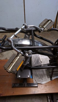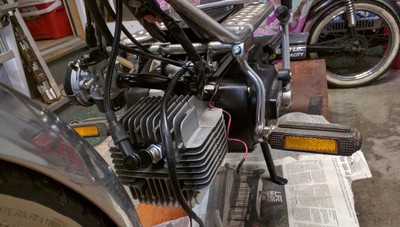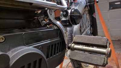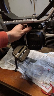 Built custom pedal foot rest. After deciding the best mounting place. I bought a bar and notched it to match the stock crank to fit the pedals. I then cut a metal bracket in half and notched the bar where I needed to add the brackets. I "welded" ( I used the welder I bought to attach the brackets but I am complete noob to welding ) on the brackets. I then put the bar in place and added the pedals. I used the engine case bolt to connect with the bracket.