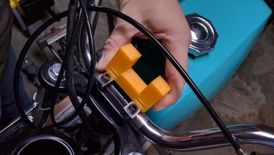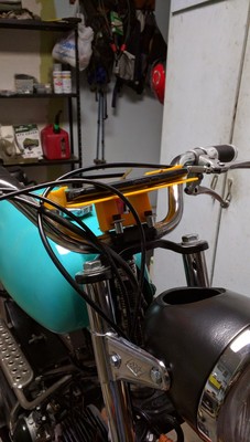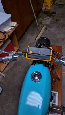 01.09.2017 Ignition switch wired and system checked for spark. :D Installed MLM Peoples Pipe. Bought new cable for rear brake and installed. Purchased fuel line. Waiting on new petcock to come in the mail. While waiting for parts to arrive, I designed a custom center mounted phone mount. Temp installed the kickstand to get the bike off of the build lift.