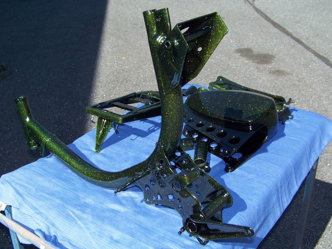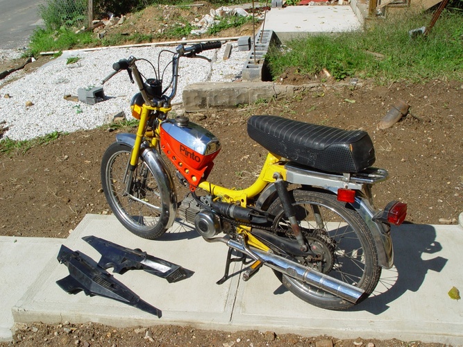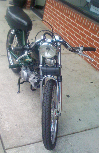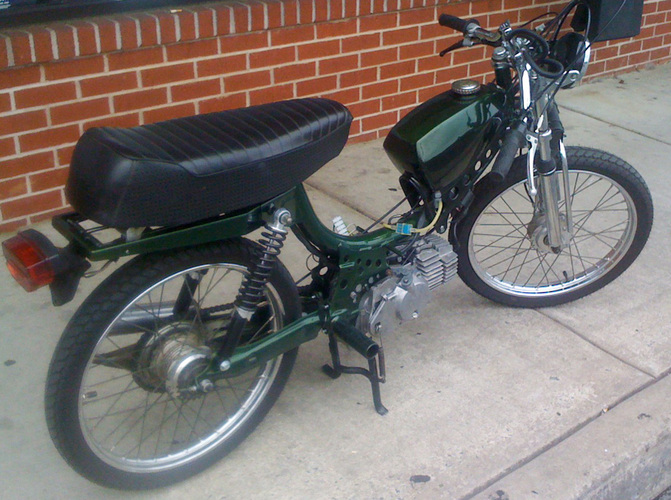 I originally bought this bike from Larry (MopedLar) in New Jersey at one of his great countryside rides. I bought it because it was cheap. I think it was $250 running. For a few years I didn't really ride it that much. I started liking the look of Pintos and Swingers and decided to use this one as a winter project. I installed new front forks, the 70cc Athena kit, Techno Esoril pipe, and had it powder coated Emerald Flake by a guy in Frederick MD. I was able to take it back up to MopedLar's last moped ride.