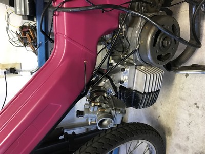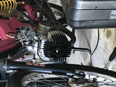 Puch E50 TCCD 50 old style w/ Dio Reed 19PHGB clone za50 high torque head windowed 11# piston 2 shoe stock clutch w/ KS springs 25lbs on boss pipe hitting 37mph on 13x45 gearing. Pulls like a pp 70kit with a bing revs till points float.