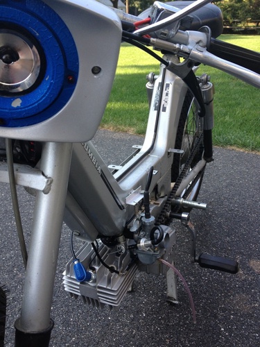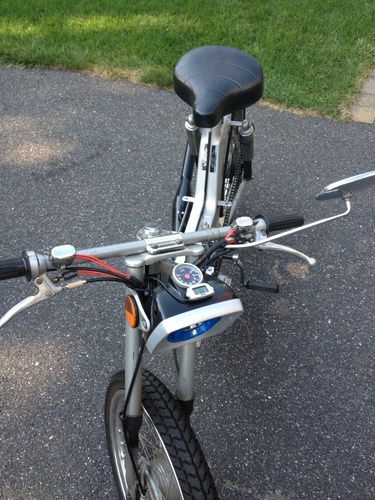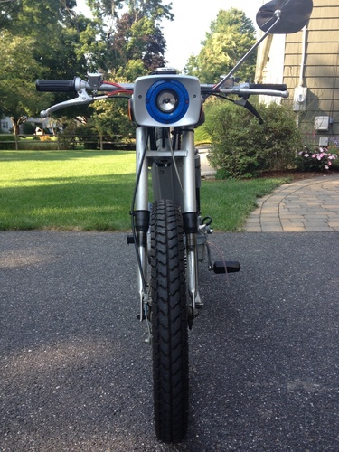 The headlight was replaced with an LED flashlight hacked to fit in the housing with the rechargeable battery and wired into the headlight switch on the handle bars. It's brighter than stock and does not dim when at idle.