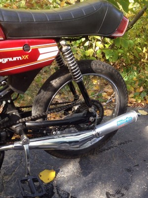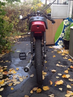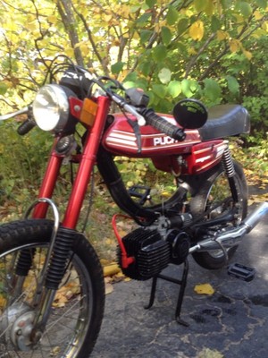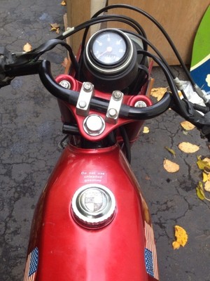 Found this in an old mill in Worcester MA. Had these sweet vintage flag stickers on the tank so I had to keep 'em. Completely torn down. Kept the stock jug with angled port..... Paired with a platnuim (LOL) Biturbo. No hack and weld..... Just a 20 ton hydraulic press and funky brace I manufactured. Treats CDI. Bored out 15mm bing with a puch Hi-flow intake. Superclutch from '77. Stock crank. Low-pro tail light. Negative fenders. Moped Clubmans from treaty's. NGK ceramic racing wire. Hid a couple wires here and there and threw on a cat-eye bar end mirror. Had a Hi-comp head on it but even after re-jet wants to run hot....WHY!!!!!??? Hitting 45mph all day but wants to pull more. Not to bad for 50cc..... May take another shot at the head this winter to try and get some low-end torque back. Any suggestions would be great!!!!
