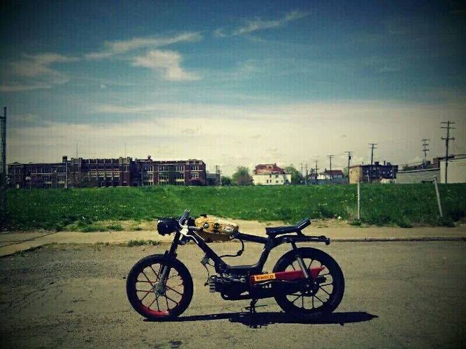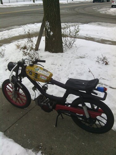/// Features /// Original, old, nasty gas tank / Cross bar is a crummy table leg that Jordan welded back in his floor crashing days at MLM's old shop in Elkhart. / Beefy stock Carabela controls. Awesome. / Cruiser bicycle handlebars turned upside down. They originally belonged to the crapbucket who stole Ted Sliwinski's Hobbit. / Hacked up Motobecane pan seat. It's not as uncomfortable as it looks, really. / Grimecas are from a 1980's Trac, as well as the front forks. / Rear suspension is stock Garelli, turned upside down to fit. /// Basically, this damn thing is a death trap, and shouldn't ever be ridden as fast as it can go. But whatever, YOLO, right?