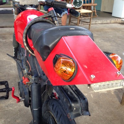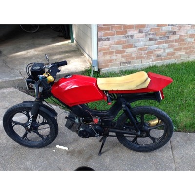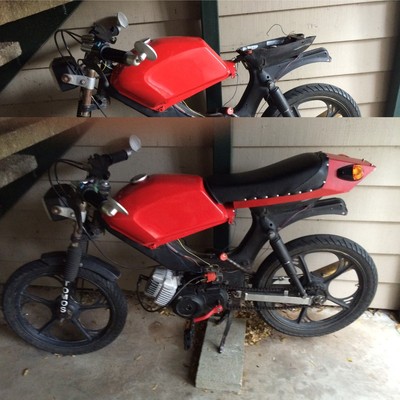 I bought this tomos from a person on craigslist for $500 but later i found out the previous owner took a spill and laid it down so my pipe has a dent in it. soon to have a streetmate swing arm and a custom puch simonini chopped and mounted on the right side theeeeeeeen getting it registered would be nice but I still need to buy some turn signals and relays! mlm seat pan and led brake light!