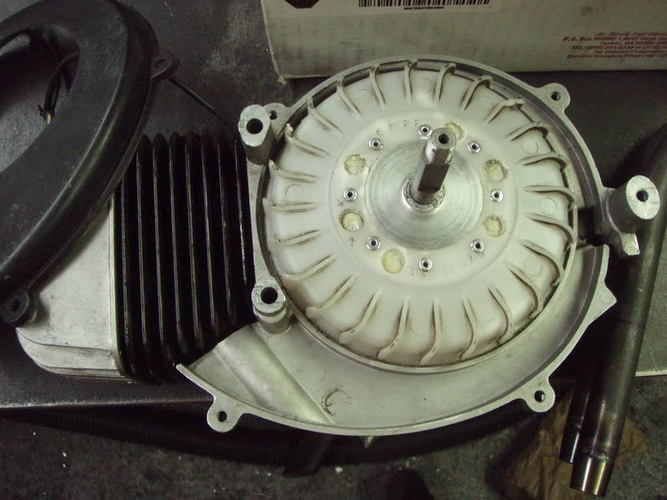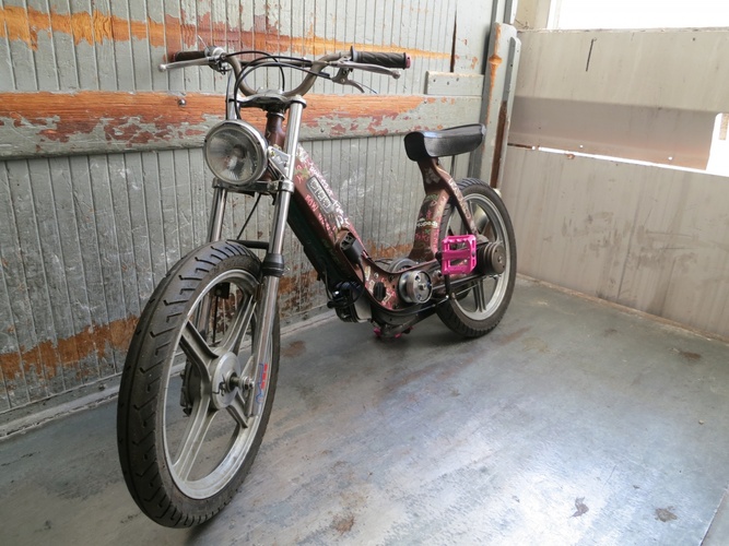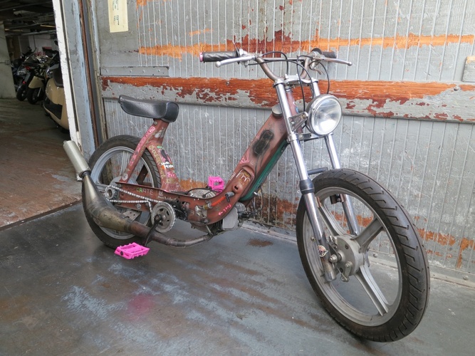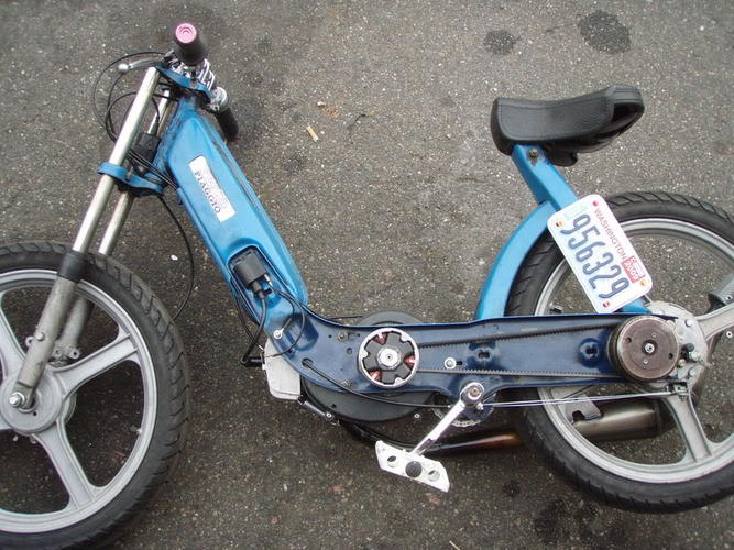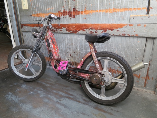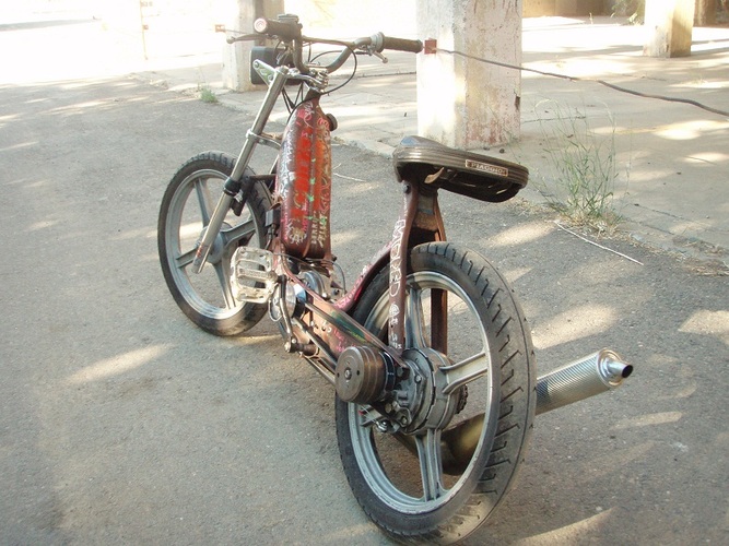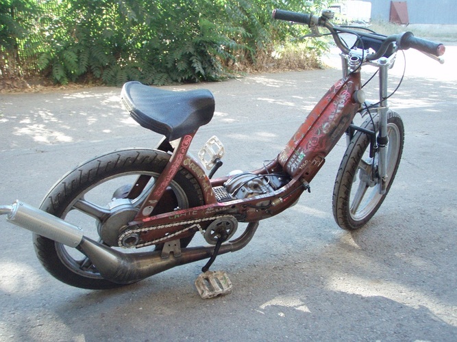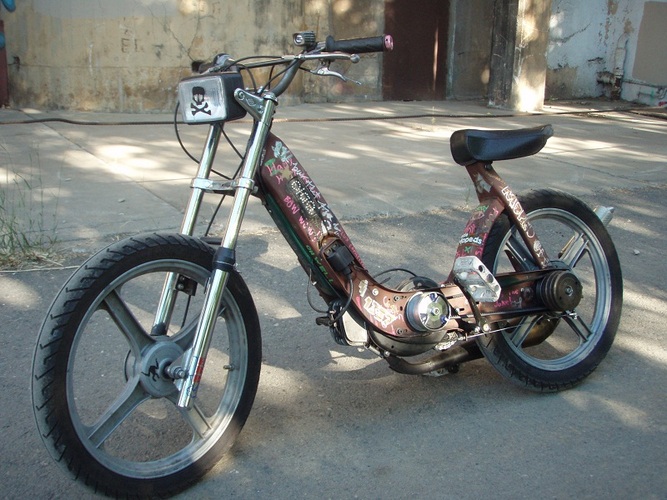 Malossi cases, Malossi crank, Pinasco kit, Dellorto 21 PHPG, KTM 50 CDI with a lightweight plastic fan, Polini variator, Simo pipe, Malossi gears in final drive.
