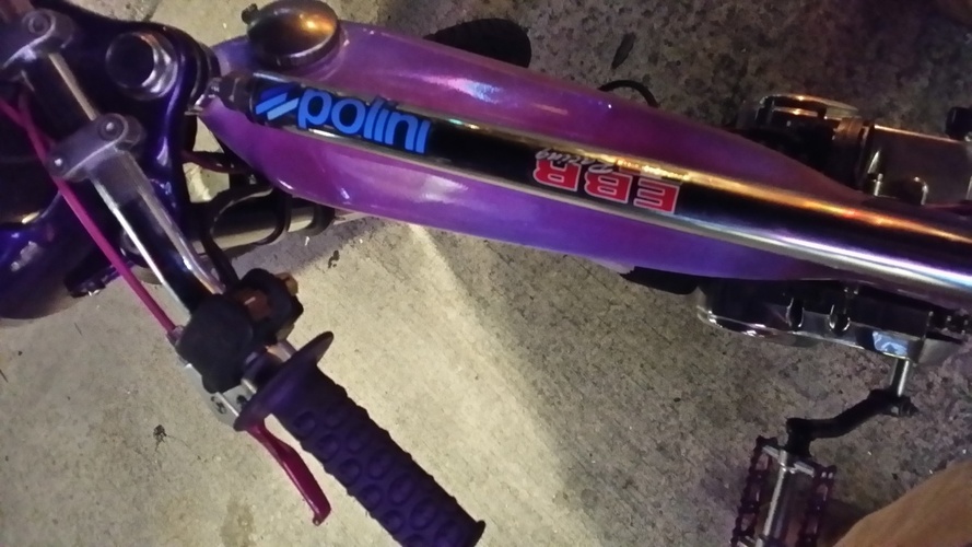 Frame was won at a raffle at a rally, from the wite line riders crew in Wilmington NC ,powder coat by area 51 ,built up every thing is new and custom powder coat ,65cc arisal,high comp head ,custom seat and rack ,polished cases,bullet wheels ,ported ,case matched,15carb,techno pipe,drag bars ,zundap headlight,honda70 controls,billet levers,purple anodized parts ,pink cables all wires ele tronics hidden