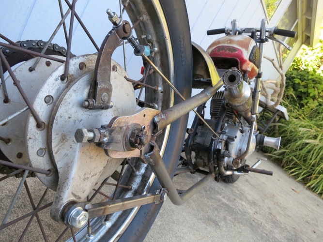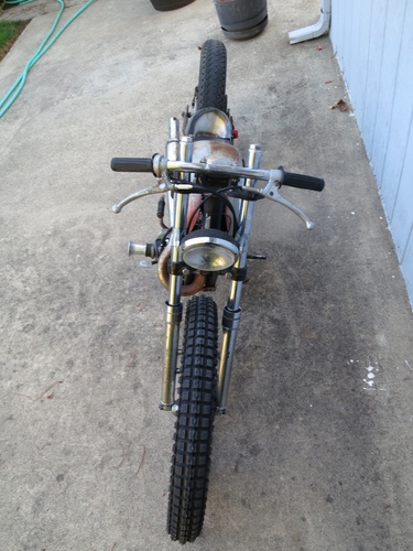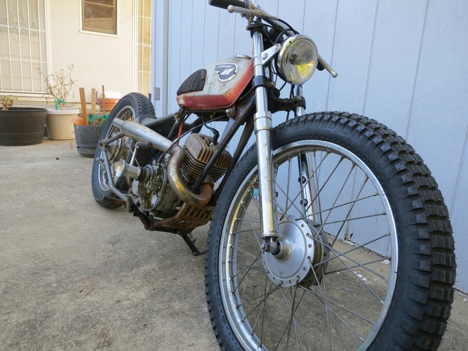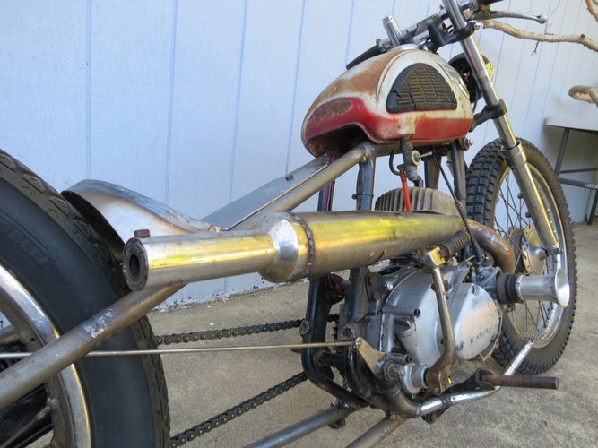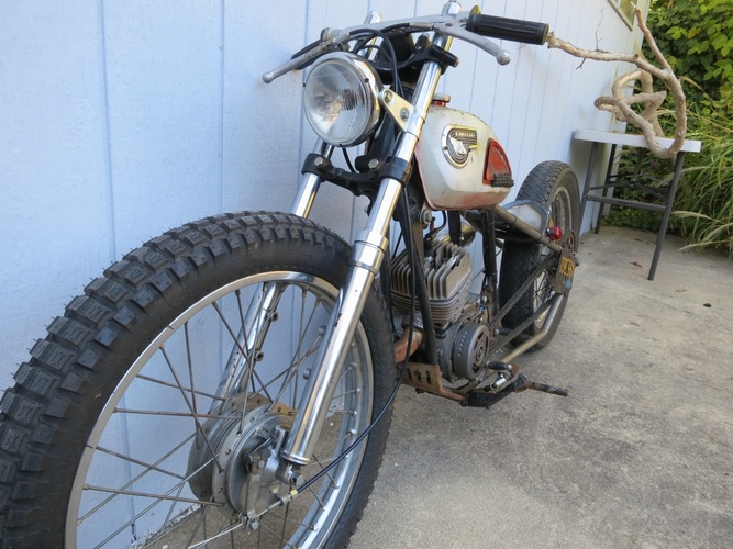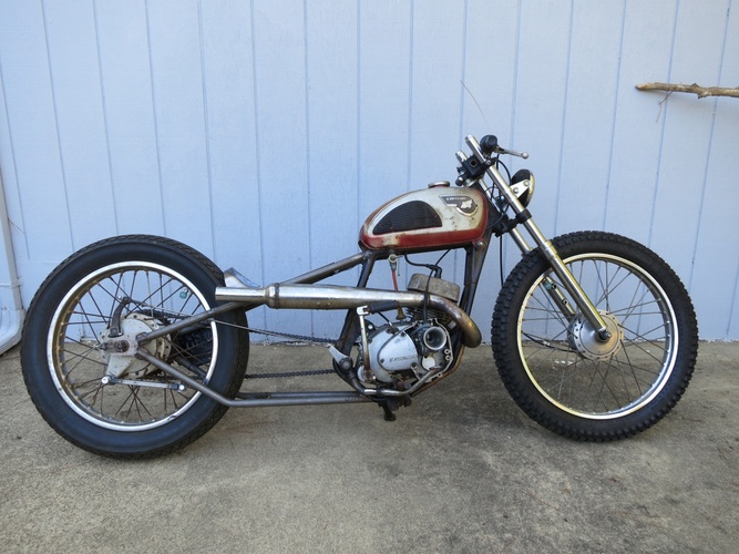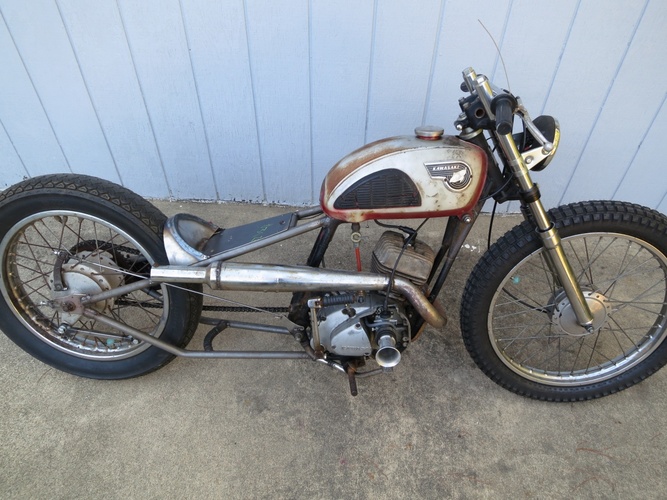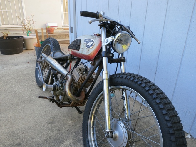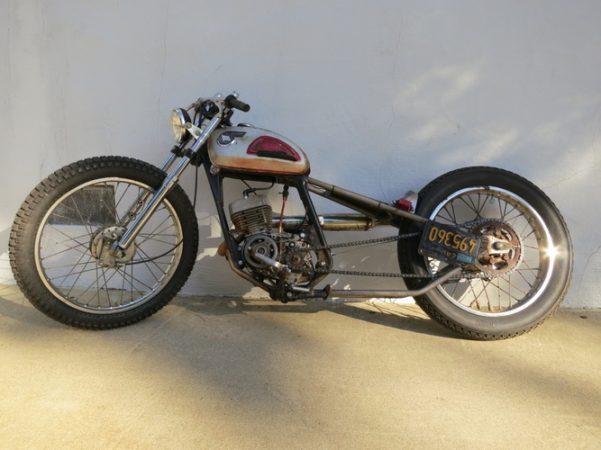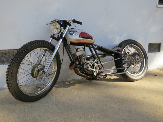 We cut the back off, stretched it a bunch, rebuilt, shortened, and stiffened up the front end off a '74 Kawasaki and slapped it on. What else? It's a super fun little 120cc two stroke city blaster. I ripped around SF on it the morning before the Dirtbag Challenge and it's perfect for the city. Way more awesome than a boring Vespa and was getting a ton of attention.
