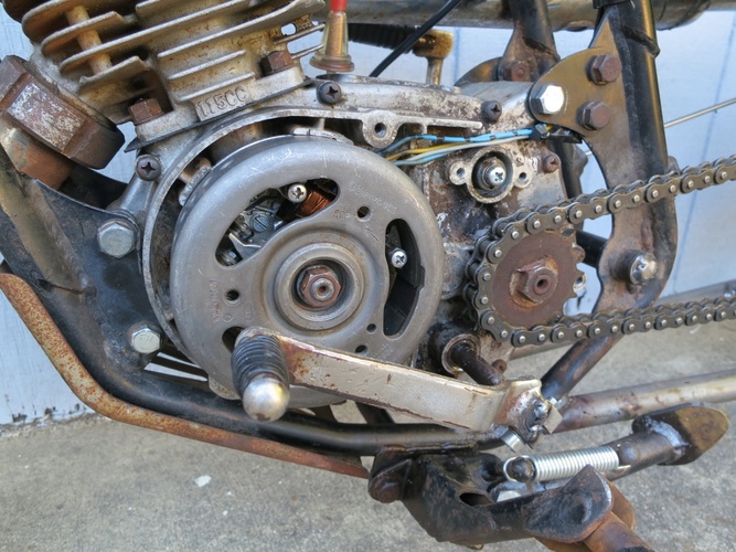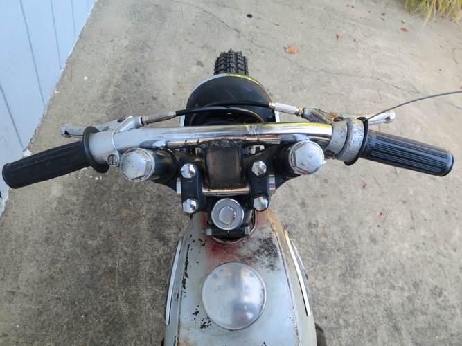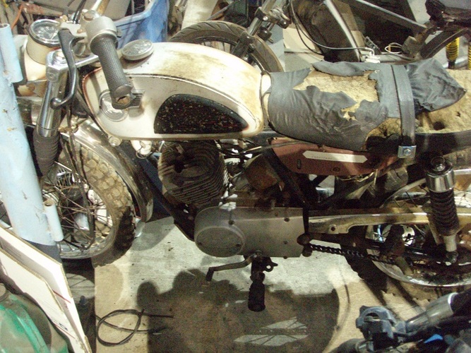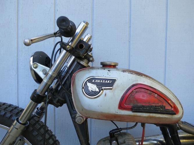This whole thing had to be built in under a month and for less than $1000, which really meant like 15 hours (after work and on weekends when we could) and ~$300 (we ain't got $1k to drop on something like this). This is a '67 Kawasaki Roadrunner 120cc baby enduro that Ryan and I paid a guy $50 for. It had been sitting in his backyard for 20 years, so he said. It had not been registered since new.