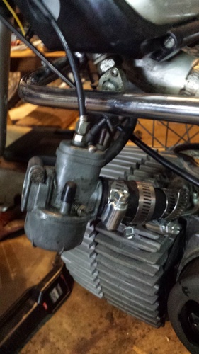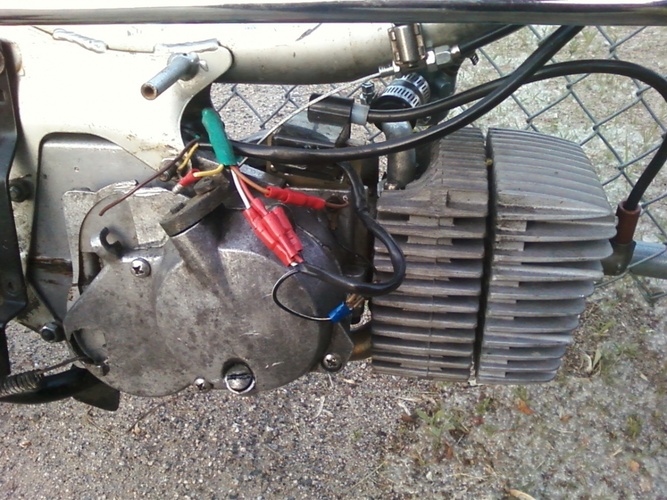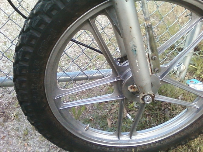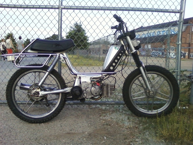 Trade Soft Intentions (my solex) for it and built it back up with some old e50 cases, a55 topend, BACKWARDS bing hose-clamped to the intake. stock gutted pipe, and some sandblasted 5 stars. The knobbies were around and the original small wheels were pretty wide so it even fit 3's