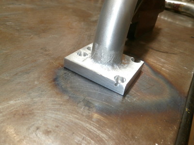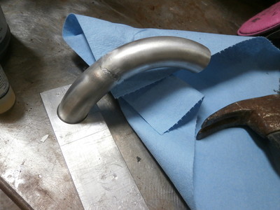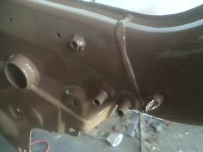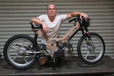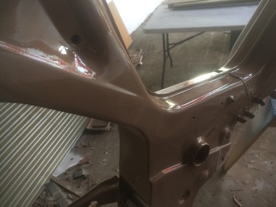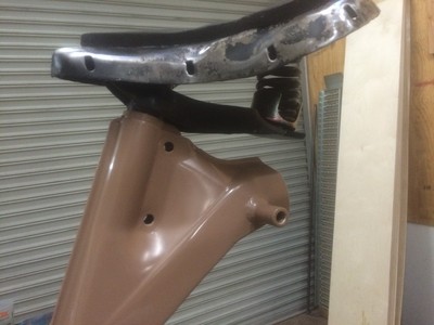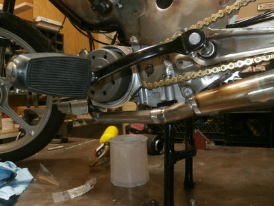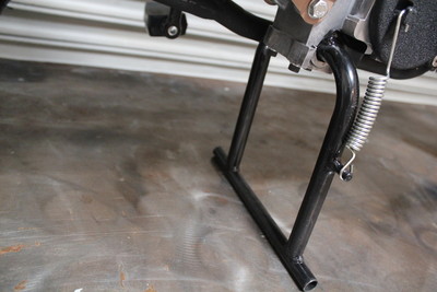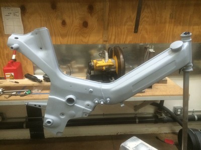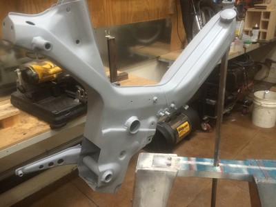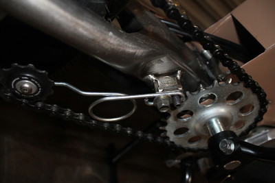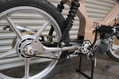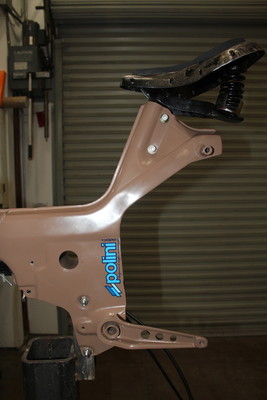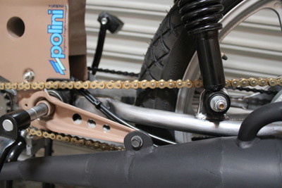 Frame had rear sheet metal cut off and filled in. Welded on various mounting lugs for electronics and ran tubing all the way through frame at stock air box hole to act as bearing jack shaft for variator. Frame was then sand blasted and shot with single stage urethane in a Ford mocha and polished out to a dull sheen. Swing arm was made from tubes cut off of an old arm bought from a garage sale. The tubes were then welded on to laser cut axle plates. It comes out to about 46" axle to axle which at about 4" over stock, puts me at Moby wheel span. Custom idler mount. 280mm shocks. Seat pan made to fit spring underneath and covered with leather pad. Custom made cafe bars from shopping cart parts. Forks are inverted EBR's with tabs for stabilizer to fit on which is in the works. They are cut down 1.5". Magnum pedals. Trail-tech equipped!