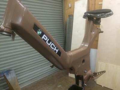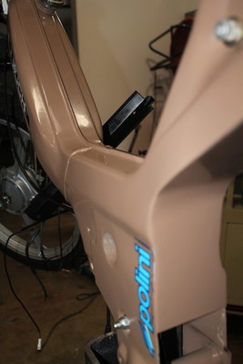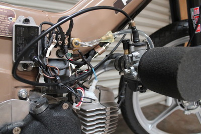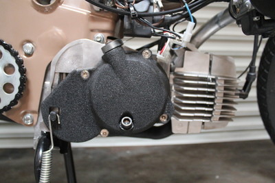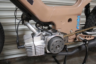 The engine is a POLINI kitted E50, 19mm Dellorto, RITO crank, POWERDYNOMO cdi, 3 puck 77 race clutch, custom aluminum intake, UNI filter, wrinkle powder coated trans cover, TOMOS side bleed Estroli made to fit, and custom kick stand.