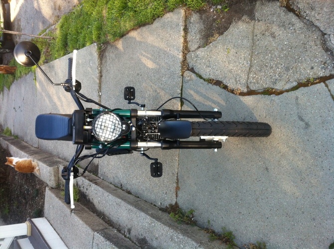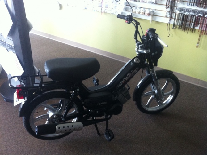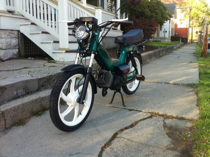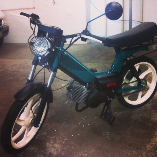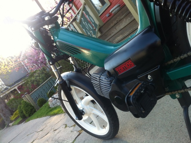 Not much of a build as a customization. Bought a brand new stock Tomos Sprint. I powder coat, amongst other things so I figure I'll make it my own. New handle bars, seat, big bore kit, headlight, color on everything, decals, etc.