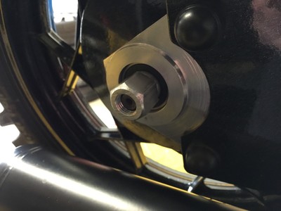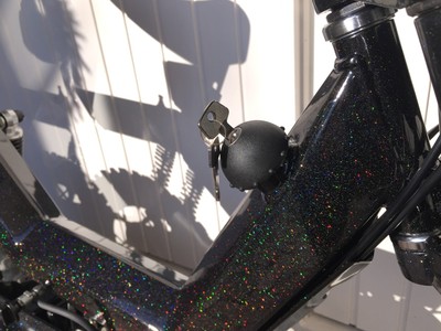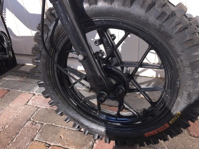 We opted for 12" cross-tires / dirt bike for a more rugged look. The tail light is mounted on to the back of the seat pin for a cleaner look. The license plate is mounted on the left side of the bike. The bike is equipped with a stronger and more reliable custom CNC-machined Aluminium (6062 T6) rear wheel bearing plate (a MOPARTS RACING Production).