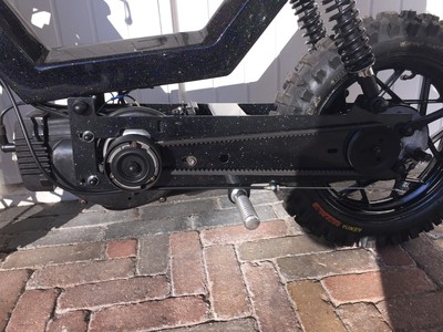 Seeing as this will be a bike for a first-time rider, the motor remained pretty much stock. It has tighter clutch springs, a 13/13 carburettor and a stock-looking unrestricted aftermarket exhaust. Top speed should be around 35km/h to 40km/h due to the relatively big pulley. However, acceleration is great.