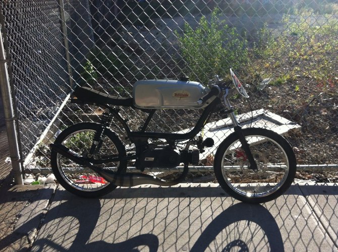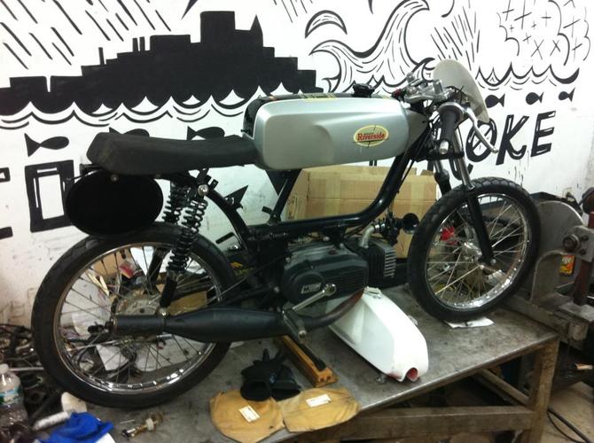 Stripped down General 5 Star with a dual variated Minarelli C2 engine. CB125 forks with disc brake. Scitsu tach. Peugeot Ninja g3 pipe flange mounted by Austin Tremellen.