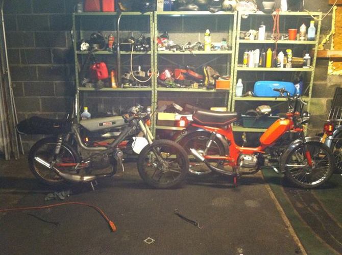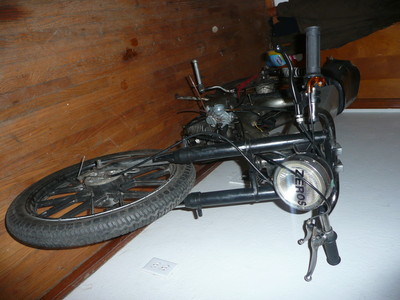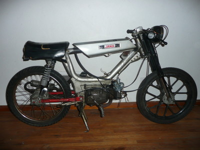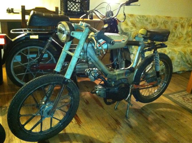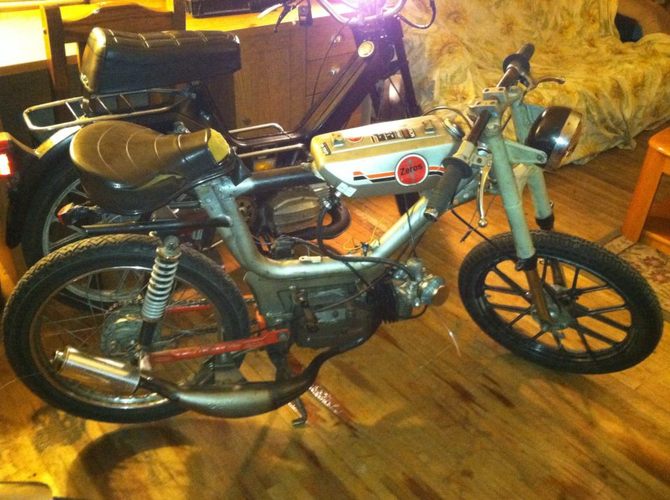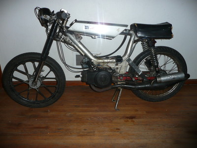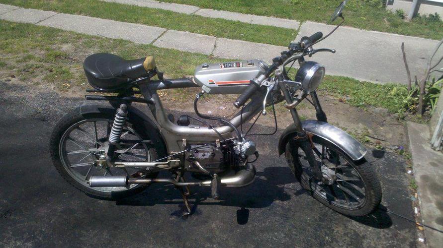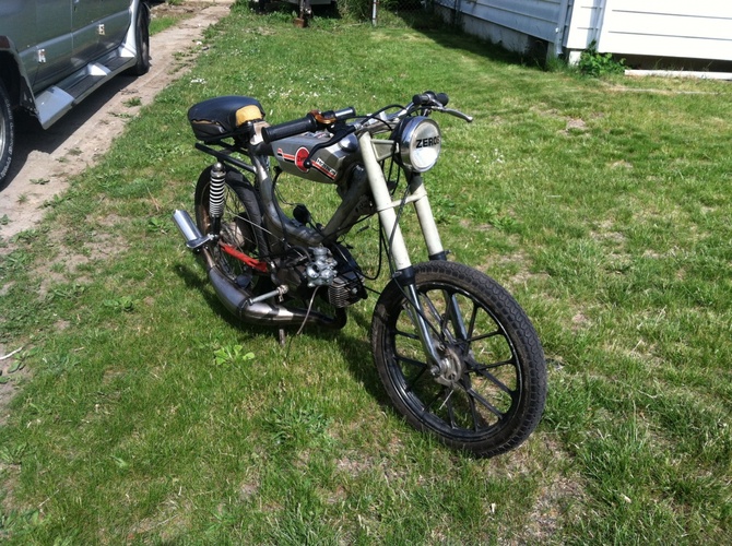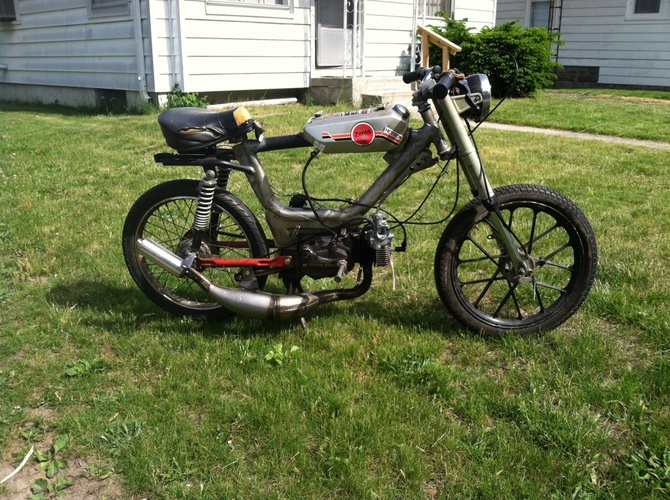 Motron frame put together by the OHpeds, engine rebuilt by myself. This death trapped tried to kill me at WizBiz this year when the front sprocket cracked in half and locked the back wheel up sending me flying, bike flipped 5 times I flipped 4 a few cracked ribs and other fun later she was reborn! The rebuild included a new swing arm, bars, spoke rear wheel, and a set of Garelli Hydros. With the Mear/VM20/Needile bearing V1/Puch Estoril/Ed's clutch springs/10x30 she cracked 60!