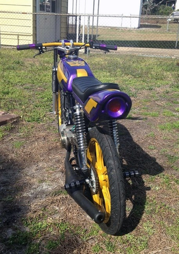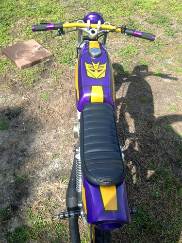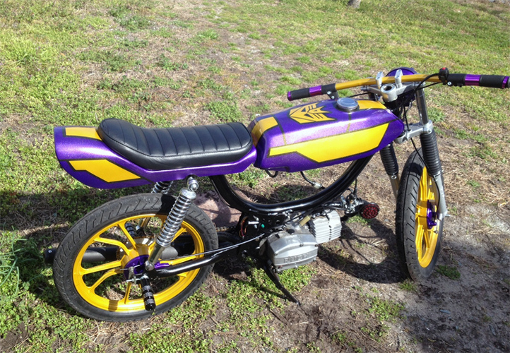 Transformers theme painted magnum 70cc athena AJH kitted and case matched ZA50 with dellorto 20mm phbg carb. 12v stater/cdi conversion. Sprocket gearing 19 to 33 achieved by chopping pedals and Tomos rim swap. Custom made fiberglass and PVC cafe seat with replacement trailer LED. Running 55ish