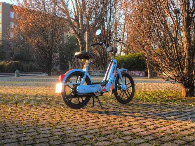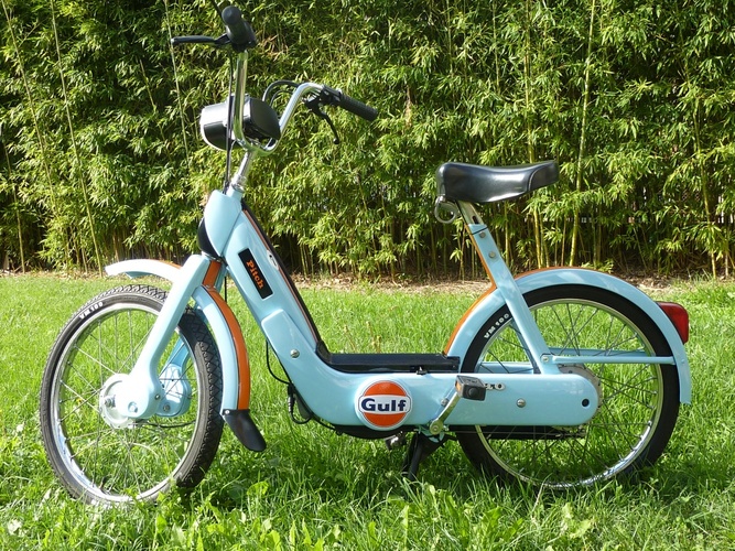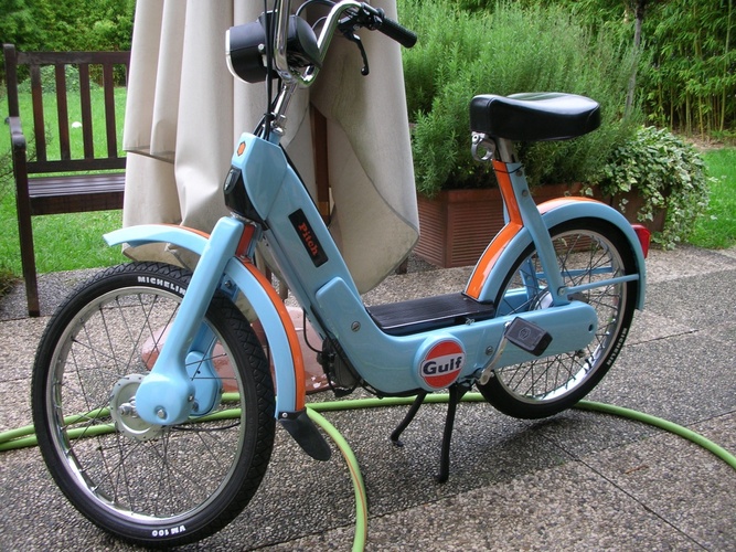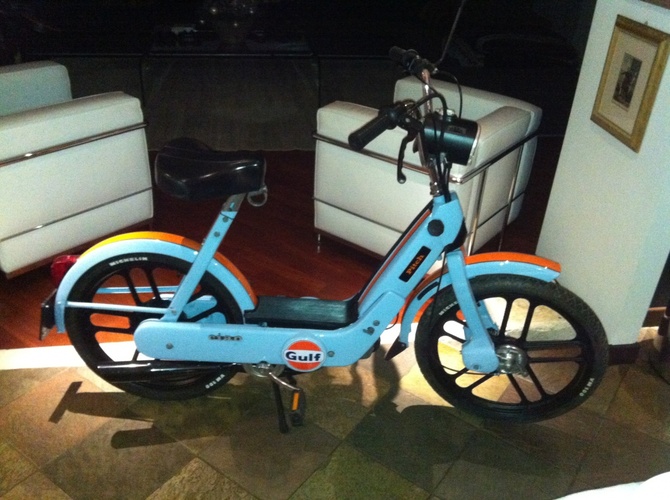 That's my 1989 Piaggio (Vespa) Ciao P Gulf racing replica. Originally white, completely torn down, cleaned, polished, painted and re-built up custom made with stock engine, alloy wheels and Faco Imola double pipes. Sure to make heads turn when passing by (did I mention it's 100% road legal?). Be sure to check my FB page for more pics!