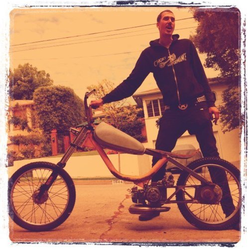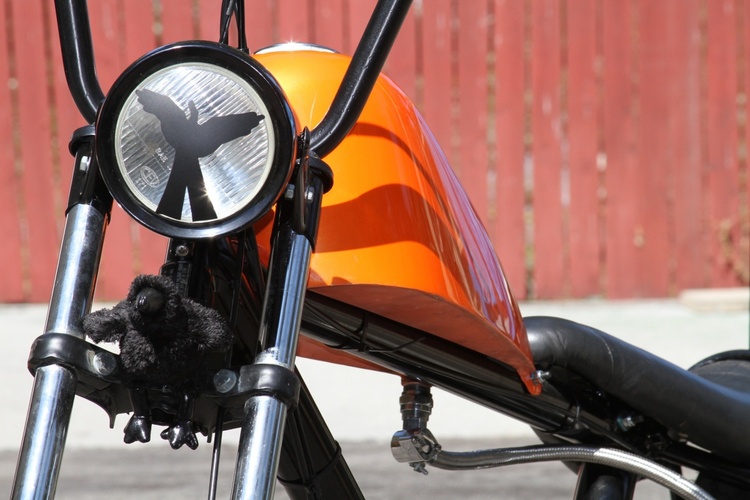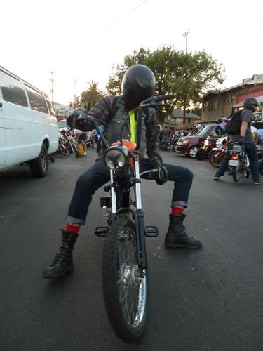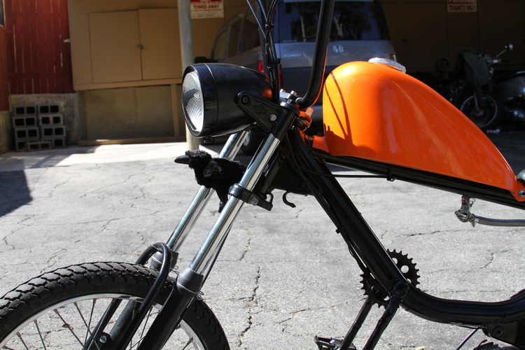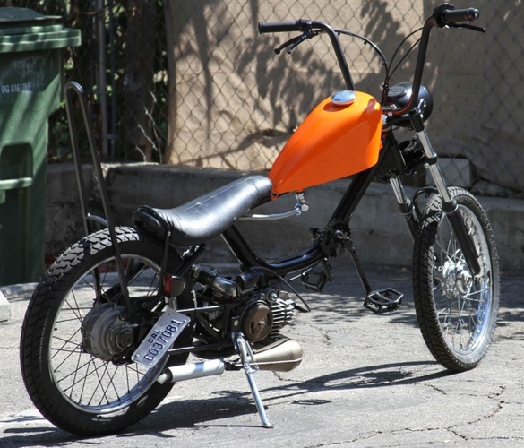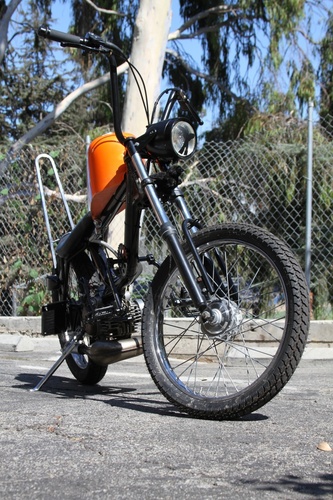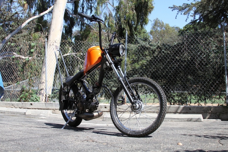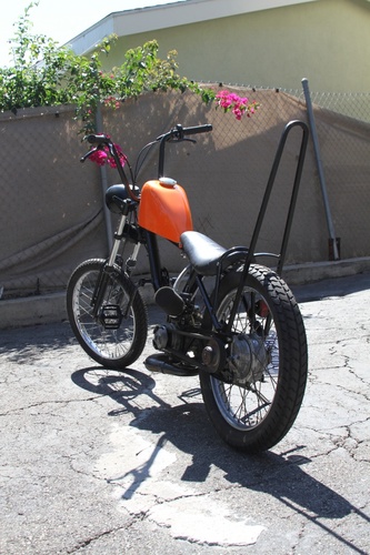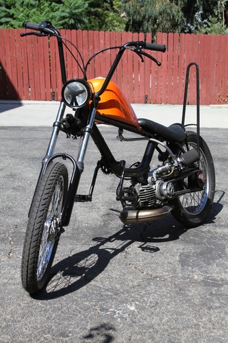 Harley Sportster tank was frisco'd then narrowed 2 inches to keep the match the front of the banana seat. holds about 2.25 gal of gas. probably around 80-100 miles on a tank. Not bad for a kitted bike with Mikuni 24 that can easily stay at the front of the pack a sissy bar to further insure rigidity and for raddness effect. Tomos bullet head light with a satin black bowl and a mirror black rim The frame is mirror black and the subframe is satin. The engine pa 50 II bottom end with racing crank new bearing. Parma kit slightly ported and matched perfectly Honda dio 6 pedal reed box and Mikuni 24 powdercoated mirror black Proma circuit pipe. DriveTrain Modded pa50II variator with pa50 weights EBR puch magnum forks with puch skinny wheel with a 2.25" Gazelle and the rear is a 3" gazelle. All the powdercoat was done in house through my company KandyKotes.com