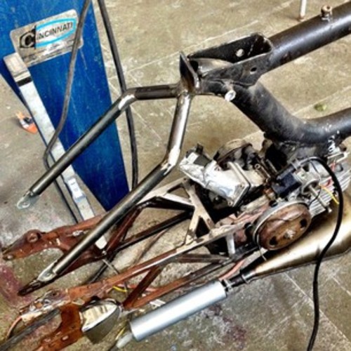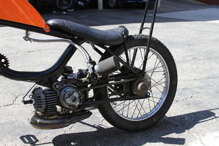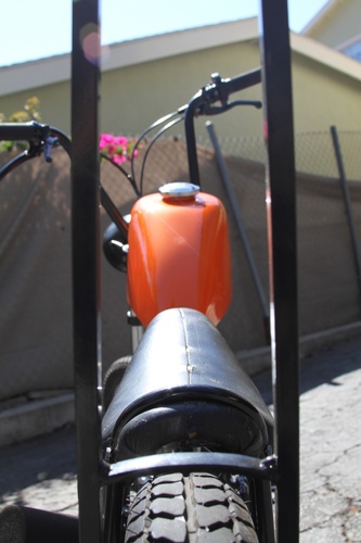 The swing arm has been relocated 6 inches towards the rear, an custom subframe to increase rigidity. Top bar added, and the rear of the frame was clilpped off behind the seat and closed up neatly, a Hardtail section was built and connected under seat. Schwinn banana seat recovered was fit to hug the tire. Cutom plate mount Tank