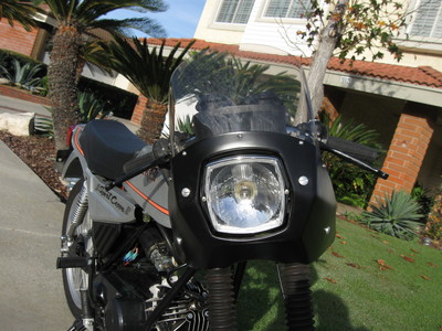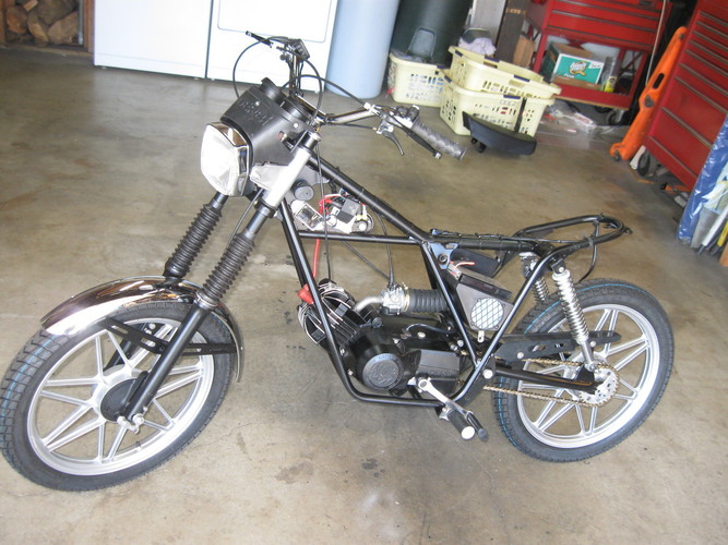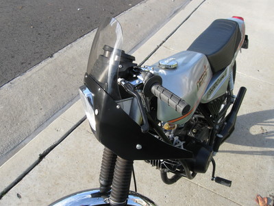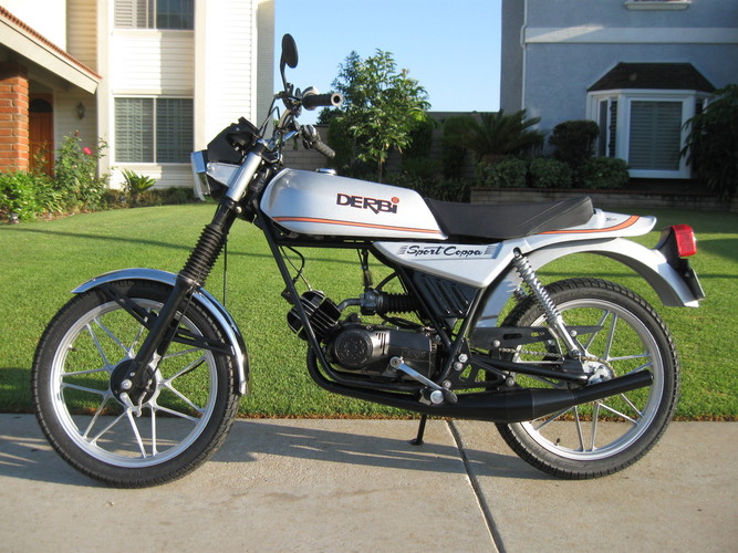 It is actually a 1980 Sport Laguna with 1135 miles on it that I am building as a European-only "Coppa". This involves using the European Rinder 335 headlight and upright handlebars (infinitely more practical). I used RD-50 fork tubes (that are 1" longer than stock ones) so I left that 1" space open on top (with a removable tubing spacer) if I ever want to change handle bars to the short street racer ones (doubtful). I again used the PowerDynamo 12V system with a small battery (visible on top of the air cleaner). Besides changing the bulbs you need to rewire the brake lights to "conventional" and use Tomos brake light switches. I will probably steal my daughter-in-law's PR Variant DS-50 converted starter for it (when she's not looking!). I just finished the tank, side panels, rear fender and “spoiler” silver/titanium painting and will do the clear coat next week. I was lucky enough to acquire a complete set of decals (including the “ring” decal around the filler neck – in Spanish!) from a guy in Spain that makes reproductions for ALL of the great Spanish Bikes. They were not cheap but how many times will I be doing this? Parts used and not shown: The new Weak-ends Derbi Sport Laguna Pipe, PowerDynamo ignition and a Metrakit PP/PR crankshaft,