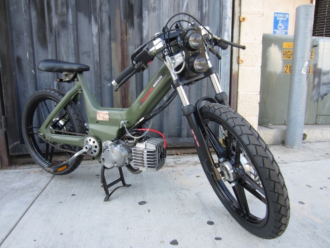Puch Maxi N by Tomahawk Mopeds. ENGINE built by west coast moped guru Shaw: Gilardoni 74cc ported, rito crank, stock clutch, stock points, 24mm mikuni, tomahawk steel intake, estoril pipe restricted. CHASSIS: EBR fork, mike thomas disc brake, tomahawk clipons, streetmate R headlight, puch custom seat upholstery. Green and black powder coating.