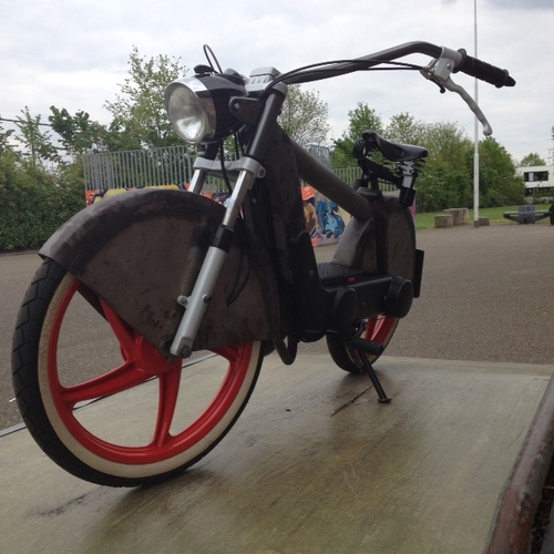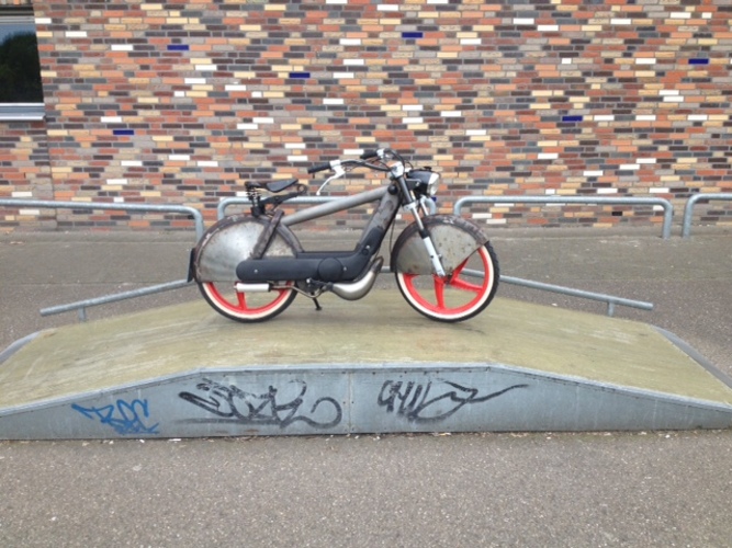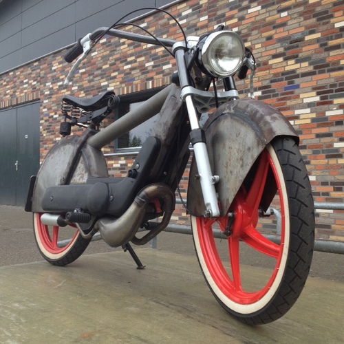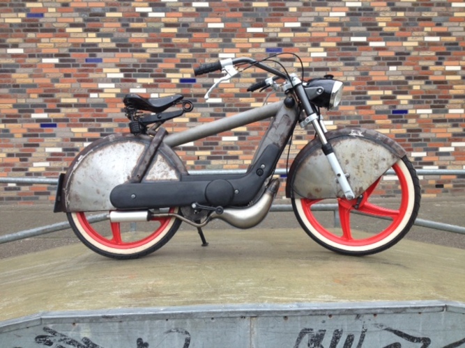 Vespa / Piaggio Ciao P completly redesigned and rebuilt. Shortened Gilera Citta front fork, Wide Bicycle handlebar, progrip handles, Sava whitewalls, CEV Original vintage headlight, Lepper Original Dutch vintage seat, DR Evolution 43mm 70cc cylinder kit, DR 43mm 70cc head, 13/13mm Dell' Ortho carburator, Malossi Air filter, Polini Variator, Malossi belt, Pinasco Clutch mainspring, Malossi white pulling clutchsprings, 100mm discs, NGK racing sparkplug, Original Piaggio kickstarter from a Piaggio Super Bravo, aftermarket lockable gascap. Piaggio big karter Tuned to 13mm inlet. Piaggio smal kick karter tuned with two extra flush channels for DR Evolution