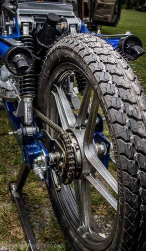 started it's life a Briton Bees hard-tail. after recieving the Dyno Jack specail, treatment which included re-doing the swingarm, changing the rake angle, and fabricate one of the wildest exhausts ever
