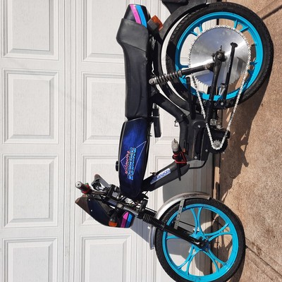 Sebring thatd been stolen and recovered and wound up with me with no engine and wrecked mounts. So I electric. Denzel d4500 motor, Kelly controller, em3ev 52v 15ah shark battery. Cut the top bar and welded a structural drop section and cut the tank bottom to fit controller and battery and all the volt converter for lights etc under tank. Repainted the whole thing w custom decal doodle by the champion of my heart, the magnificent Megan daloz.