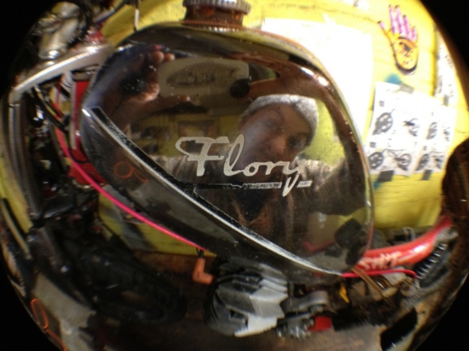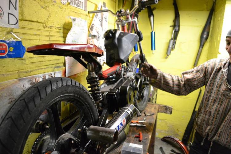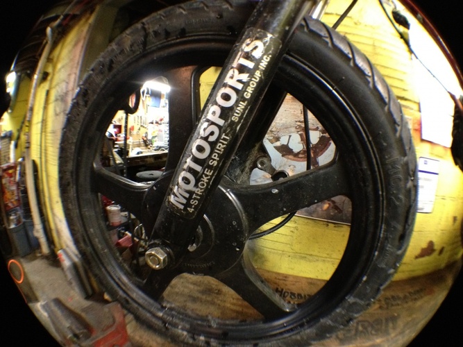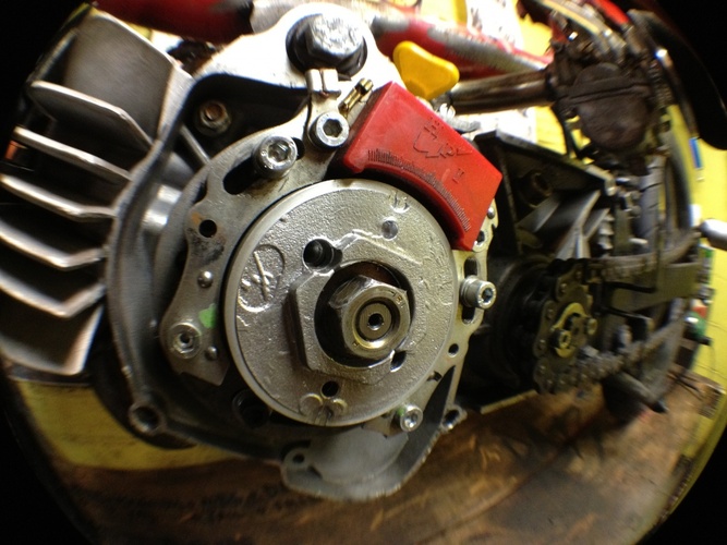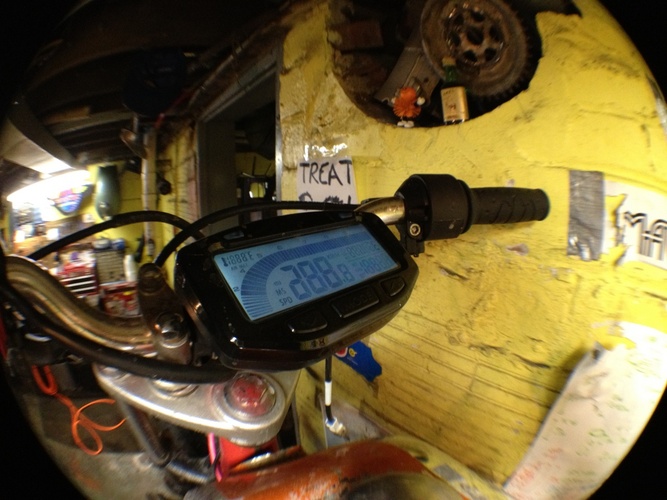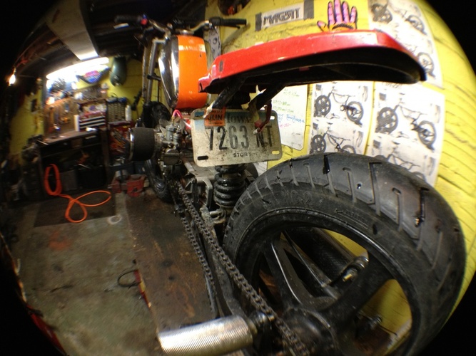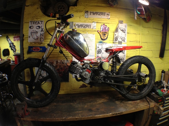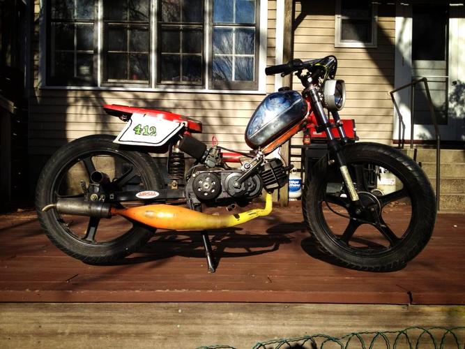 my dream bike realized. Qt50 was my first ped and i love short wheel bases. frame is a mashup of a qt, pitbike and hobbit. Rebuilt, new crank, Derbi Revolution engine with a FR kit and a puch 50cc hi compression o-ring head. AC setup. Still tuning. variates at 10.5k, peaks at 15k rpm. squish is .5mm, exhaust is about 185 degrees. 4 stroke spirit pitbike forks. revo wheels. 2.75 tires. 240mm mono shock. electronic speedo, tach and head temp. pole position for comfornt, hobbit pan for bein a sleek racer dood. pipe has a custom tapered header all the way to the cylinder. variator has 3 weights leovince (threw in with the pipe) and 3 modified hobbit weights. HPI internal rotor set @ 2.5mm BTDC. custom intake. derestricted intake path. polini blue springs (107mm bell). gpsed 50/50 (feb) - indicated 60/50 (march) - gps to come - and because it's what i get asked about the most -> it has 2 sets of footpegs, rear for sprinting/top speed, and forward normal riding pegs